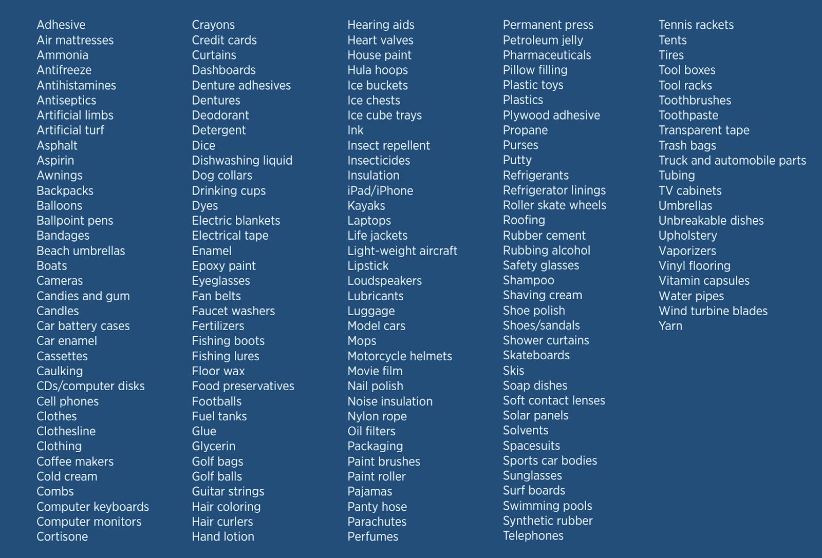 Petrol, or gasoline, is the most common and most well-known oil product, but the full list of petroleum products and the industries it spans is staggering. In transportation, it produces jet fuel (for commercial and military aircraft) and rocket fuel (for NASA and billionaires’ fantasies). For a while yet, you can’t make it to the moon, let alone Chicago, if you want to fly electric. In health, it is used in everything from antiseptics and aspirin to deodorants and hearing aids. In leisure, you can find petroleum in backpacks, tents, tennis rackets, beach umbrellas, balloons, and surfboards. In industry, you can find it in asphalt, adhesives, caulking, tubing, vinyl flooring, and antifreeze. The next time you put on a piece of clothing that has spandex, polyester, or nylon, you can thank petroleum for its products that are water-resistant, elastic, and wrinkle-free. The list below is even more expansive.