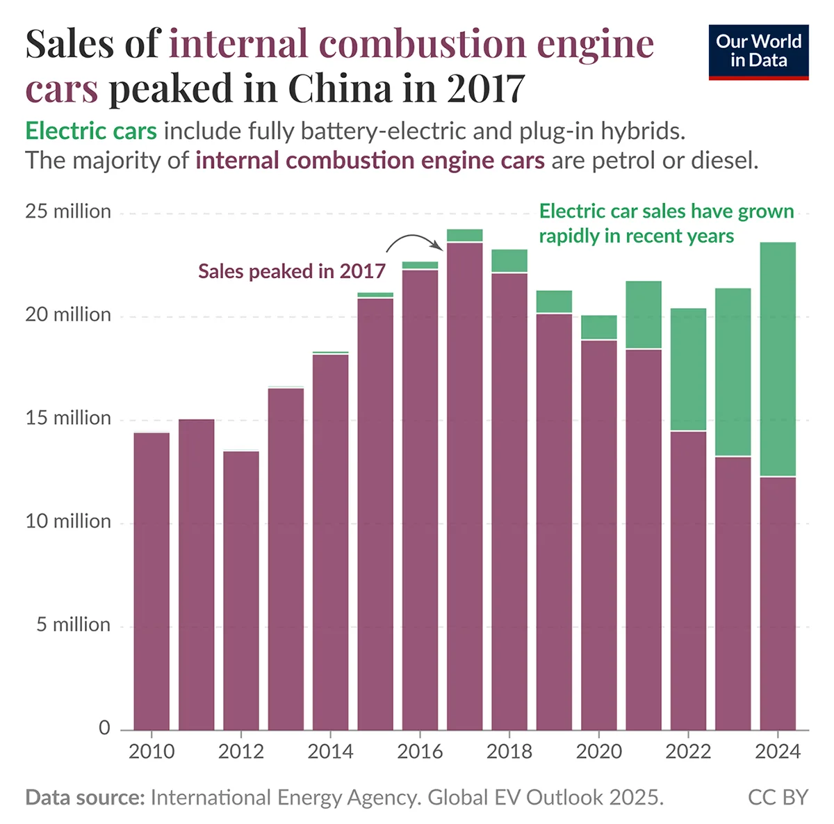 Chinese new vehicle sales 2010-2024 from Our World in Data